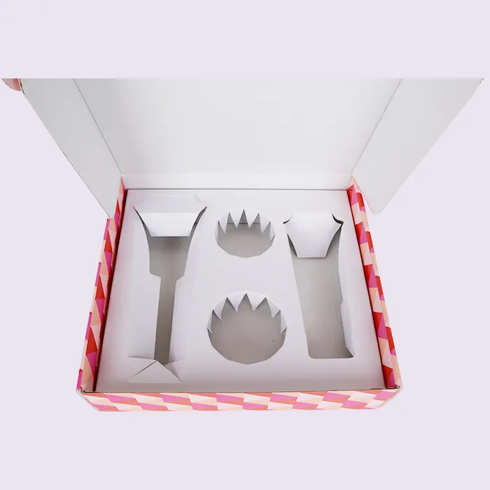 Pentru insertul de ambalare, am luat în considerare mai multe materiale: hârtie, plastic, spumă și insert turnat ecologic. În cele din urmă, am selectat inserții de hârtie reciclabilă pentru prețul scăzut, timpul de realizare rapid, simplitatea și natura ecologică, biodegradabilă. Inserțiile de hârtie pentru cutiile de expediere de îngrijire personală nu necesită matrițe personalizate, deci nu sunt necesare taxe de matriță. Designerii de ambalaje de la Doyoupack adaptează dimensiunile, fantele, urechile și caracteristicile de interconectare pe baza eșantionului și apoi produc insertul prin tăiere. Inserția de hârtie este un material ondulat dintr-o singură bucată - rentabil, complet biodegradabil și extrem de ecologic. Nu numai că prezintă bine produsul, dar oferă și sprijin și protecție. Cel mai important, reduce semnificativ greutatea totală a setului de produse în comparație cu inserțiile eco-multate, inserțiile din plastic sau inserțiile grayboard. Inserția ondulată dintr-o bucată și cutiile de expediere pentru îngrijirea personală dintr-o singură bucată facilitează, de asemenea, transportul plat.